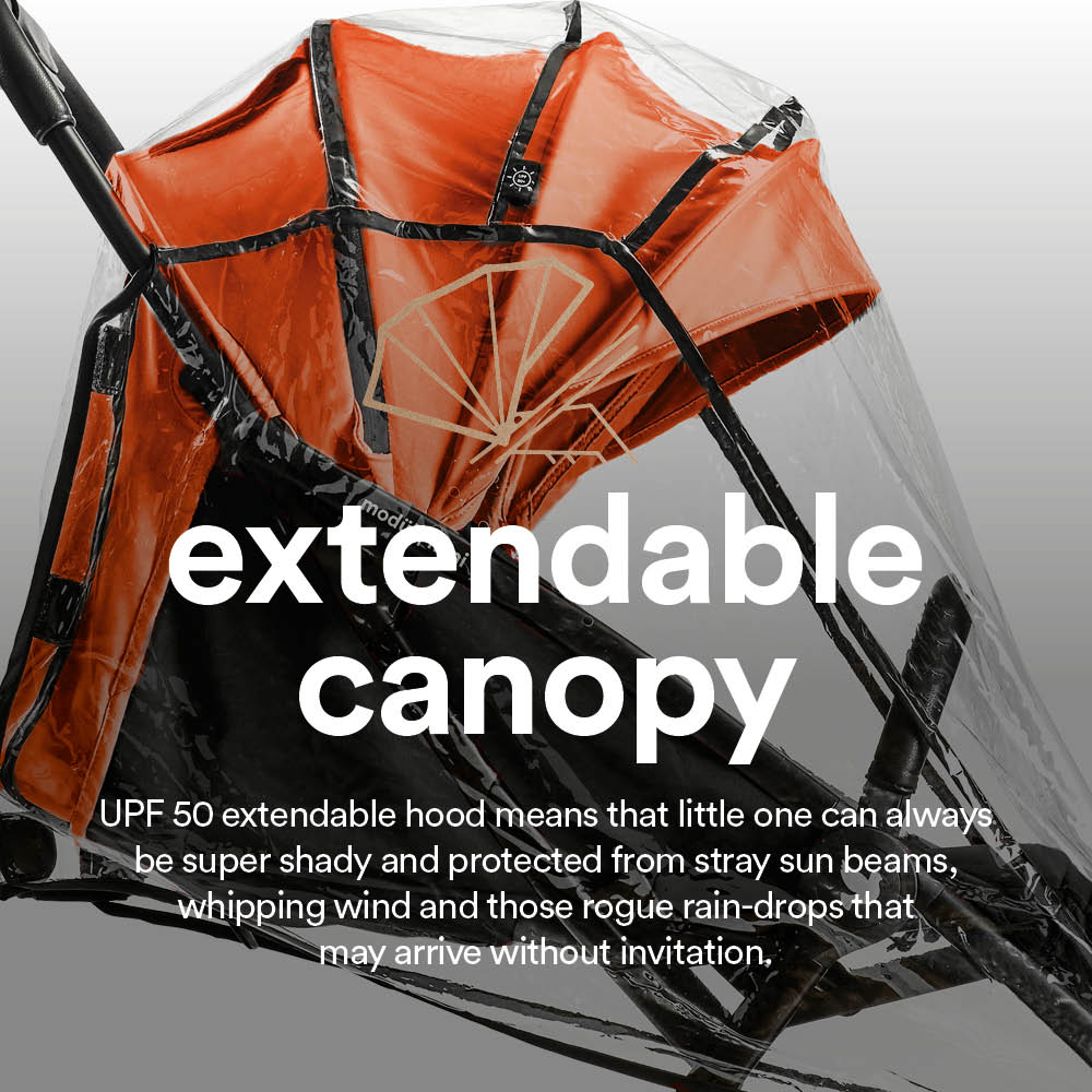 - Oversized, extendable, water resistant UPF 50+ canopy.