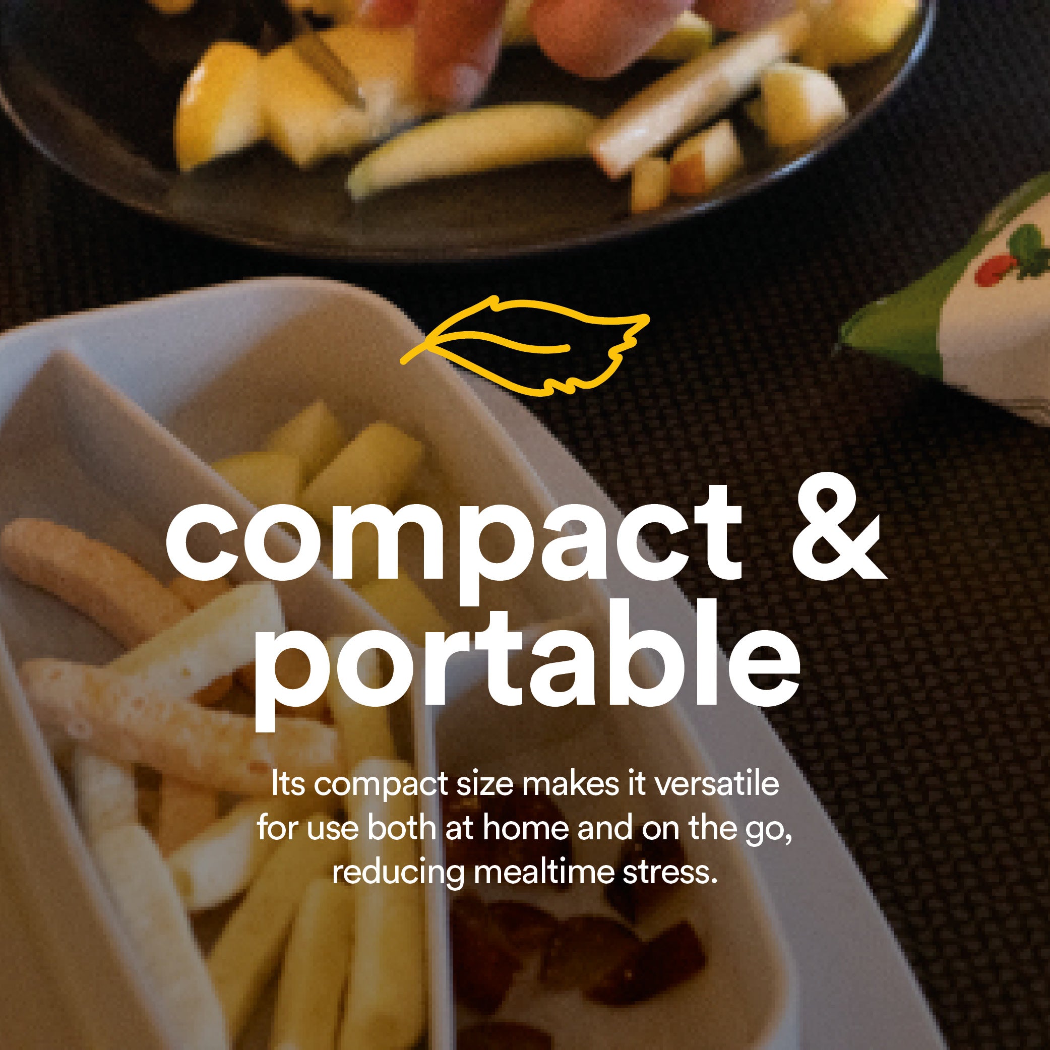 Compact & Versatile: Its perfect size ensures versatility both at home and on-the-move, significantly reducing mealtime stress and messes.