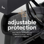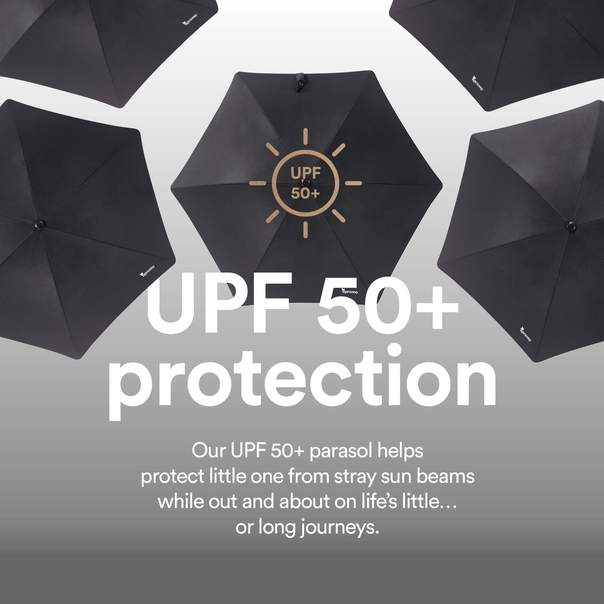 Your little one deserves the best protection from the sun, our parasol offers ultimate flexibility with two pivot points and 12 adjustable positions, ensuring optimal coverage at all times… And with UPF 50+ our parasol provides a reliable barrier against stray sunbeams. Helping to keep your child safe and comfortable wherever your adventures take you.